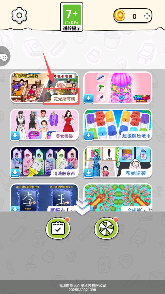 1、在游戏大厅界面,点击“花光所有钱”图标,选择你想要进行的游戏。