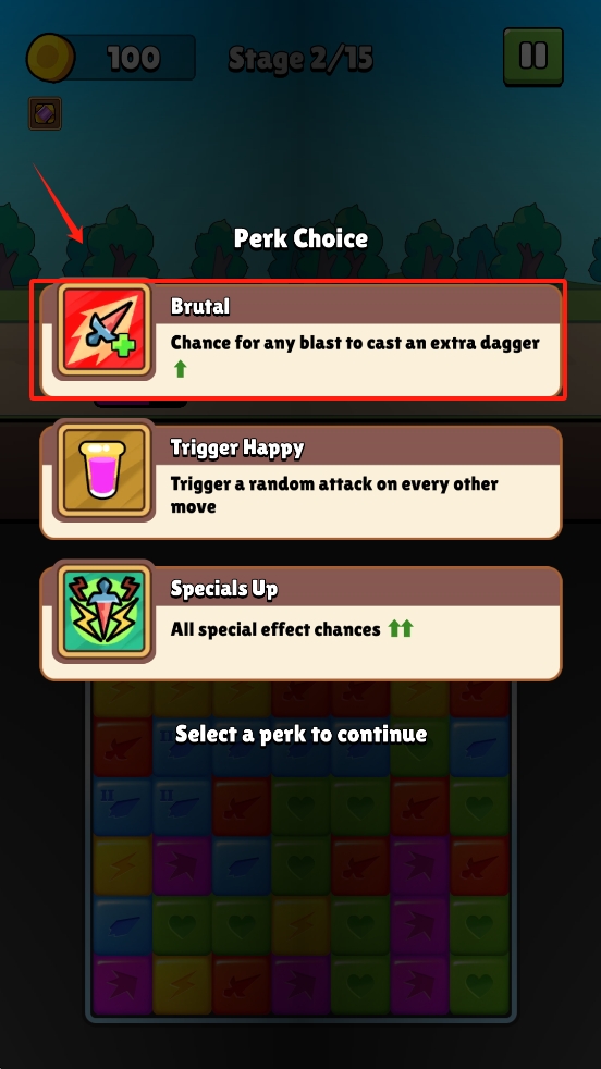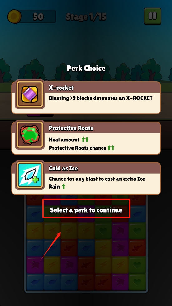 3、在Perk选择界面,点击“Select a perk to continue”选择增益技能,增强战斗力。