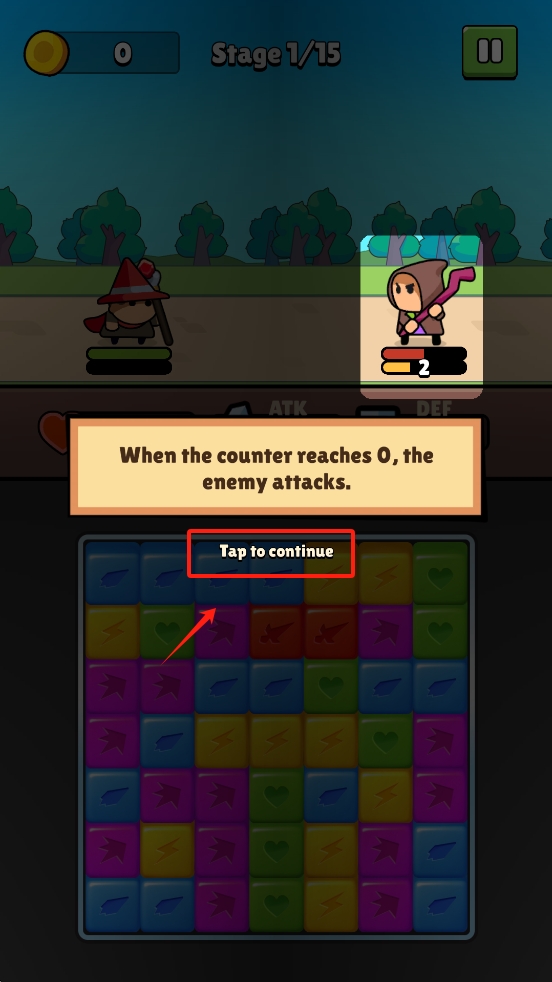 2、当敌人攻击倒计时为0时,点击“Tap to continue”继续游戏,避免被攻击。