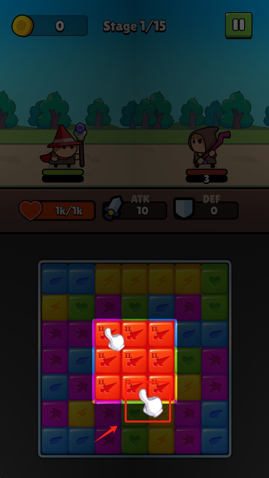 1、在战斗界面,通过滑动屏幕使三个同色的方块进行消处。