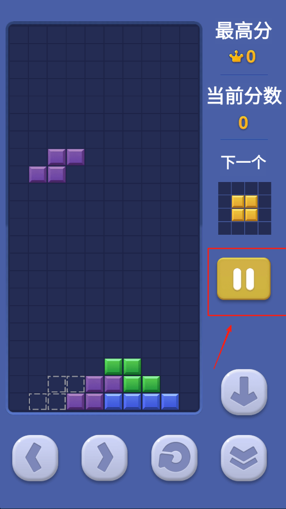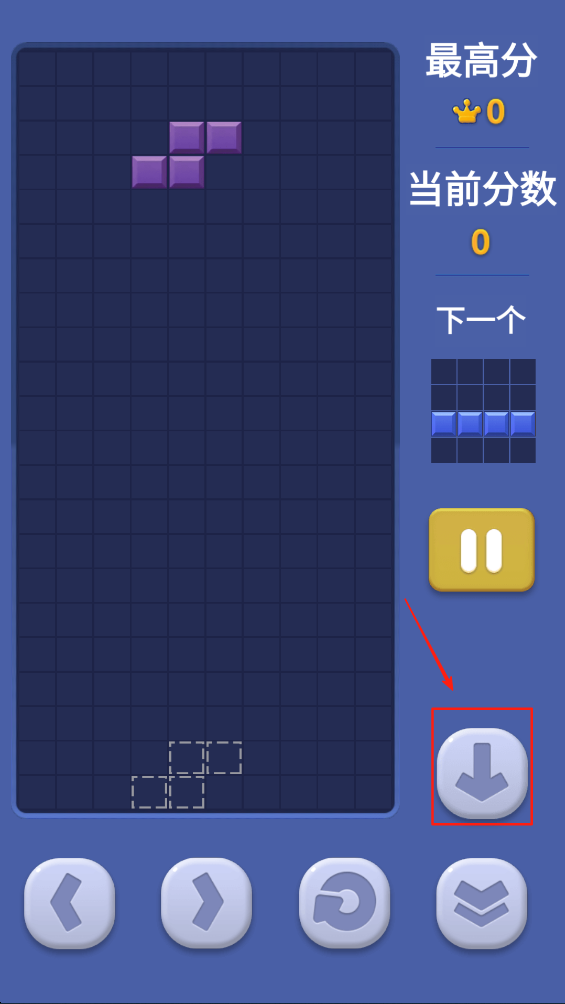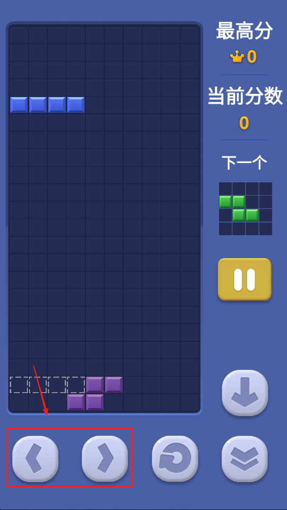 3、使用左右按钮移动方块,找到合适的位置放置,填满行以得分。