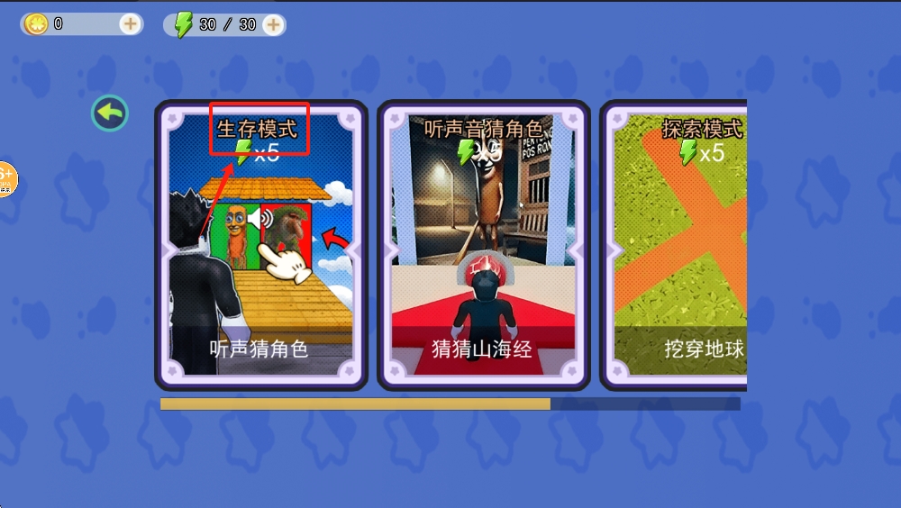 2、在游戏模式选择页面,选择“生存模式”,点击开始游戏。