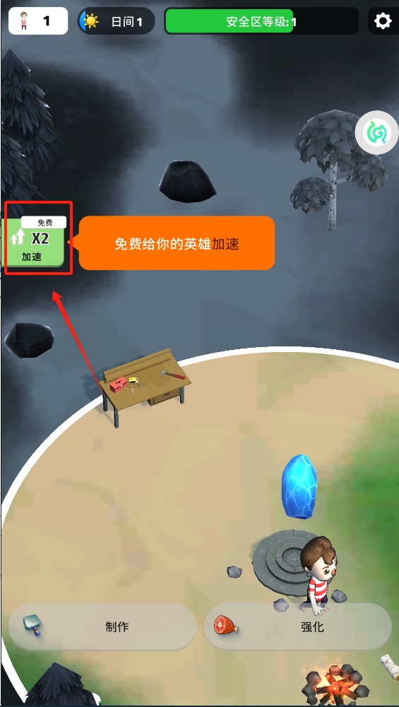 2、点击免费加速,快速完成工作台建造,节省时间,提高生存效率。