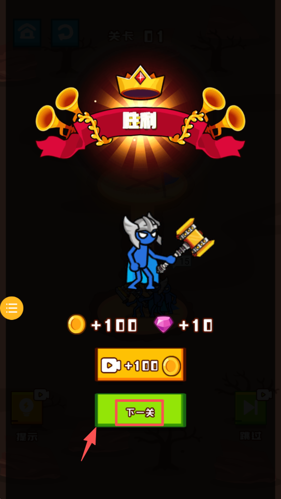3、胜利后点击“下一关”按钮,继续进行下一关卡的挑战。