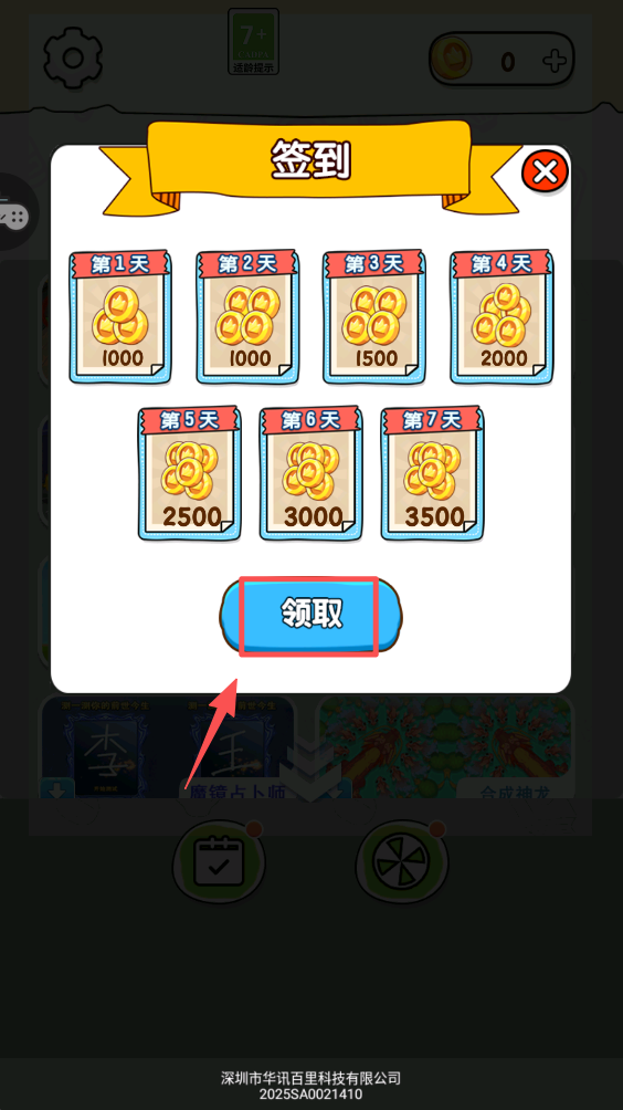 2、点击“领取”按钮获取金币,连续签到有更多奖励。