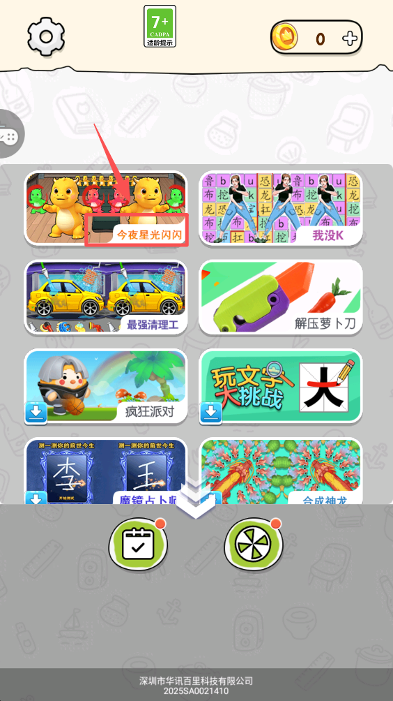 1、在主界面上,点击你想要玩的游戏图标,例如“今夜星光闪闪”,开始游戏。
