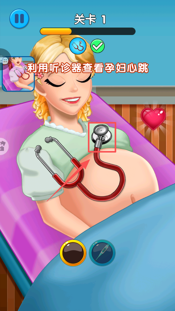 4、使用听诊器查看孕妇心跳,完成关卡。