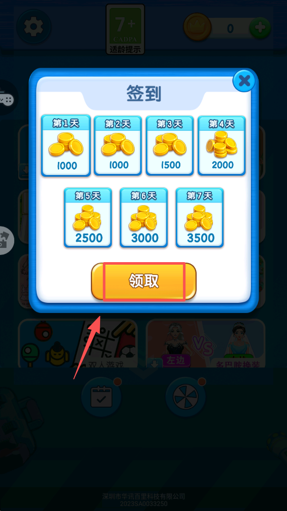2、查看每日签到奖励并点击“领取”。每日签到可以获取金币。