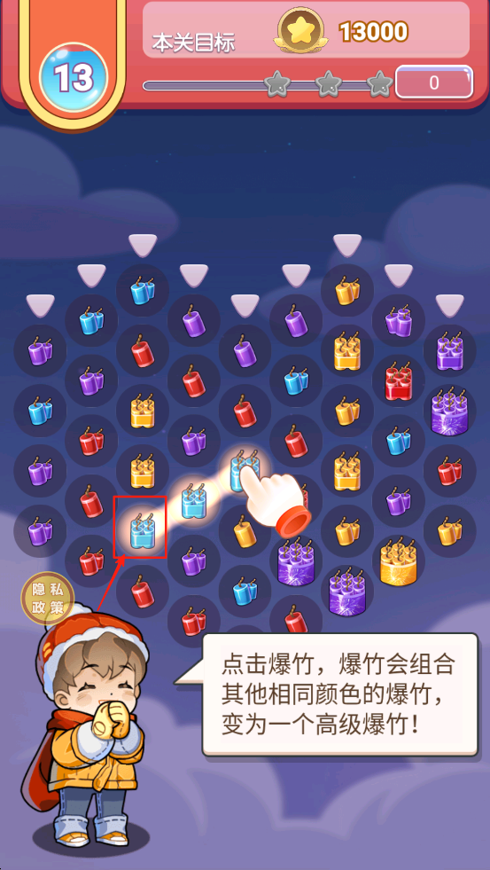 2、点击爆竹,组合相同颜色的爆竹,升级为高级爆竹。