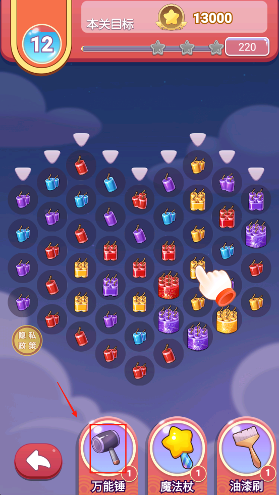 4、在游戏过程中,使用“万能锤”道具,帮助快速消除爆竹。