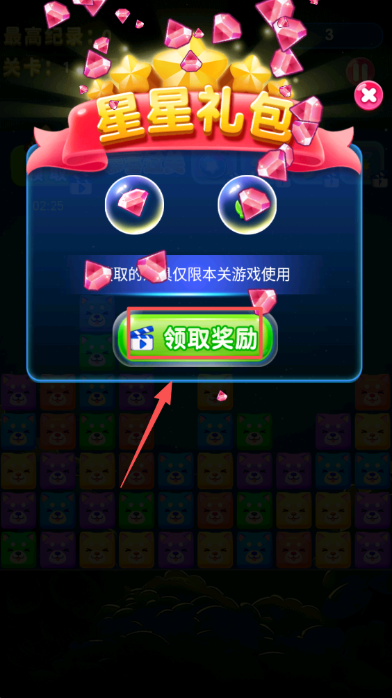 4、完成关卡后,点击“领取奖励”按钮,获取你的星星礼包,享受游戏带来的奖励。