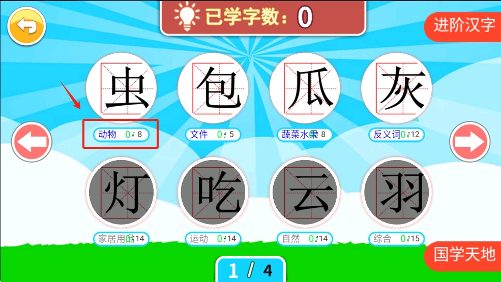 2、在汉字学习界面,选择“动物”分类,开始学习特定类别的汉字。