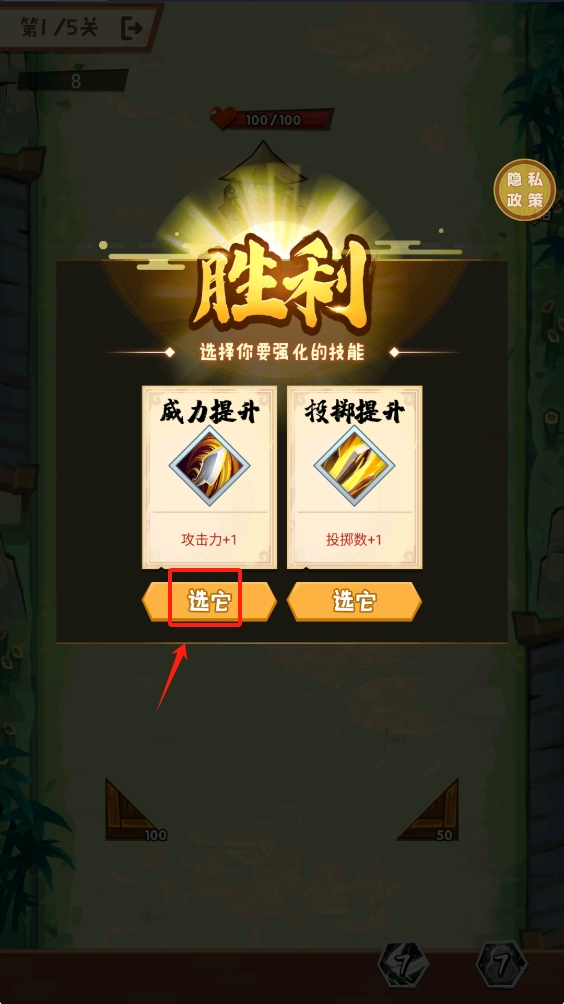 4、胜利后选择技能提升,点击“选它”按钮,增强角色能力。