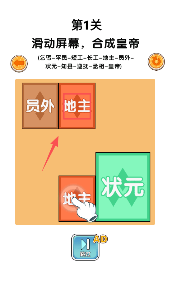 3、在游戏关卡中,滑动屏幕合成角色,按照提示合成至皇帝。