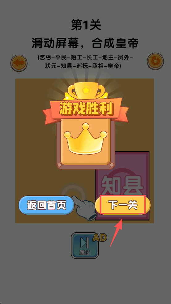 4、成功合成皇帝后,点击“下一关”按钮,继续游戏或返回首页。