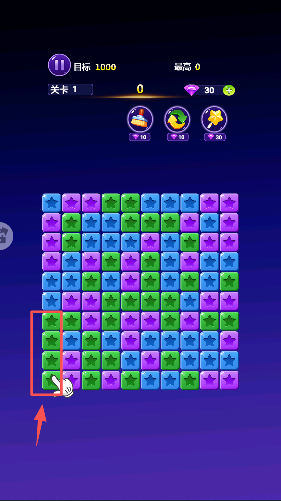2、找到并点击相同颜色的星星进行消除,连续消除可获得更高分数。
