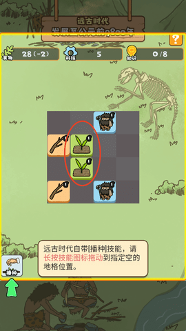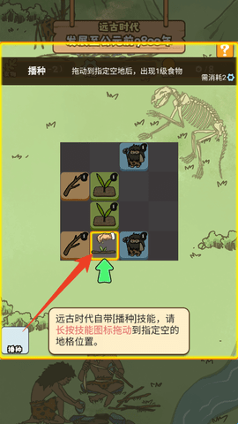 6、远古时代自带播种技能,需要长按技能图标拖动到指定空的地格位置。