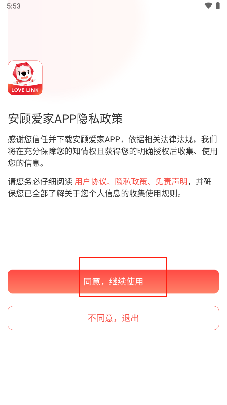2、阅读并同意隐私政策。在隐私政策页面,点击“同意,继续使用”按钮,表示同意。