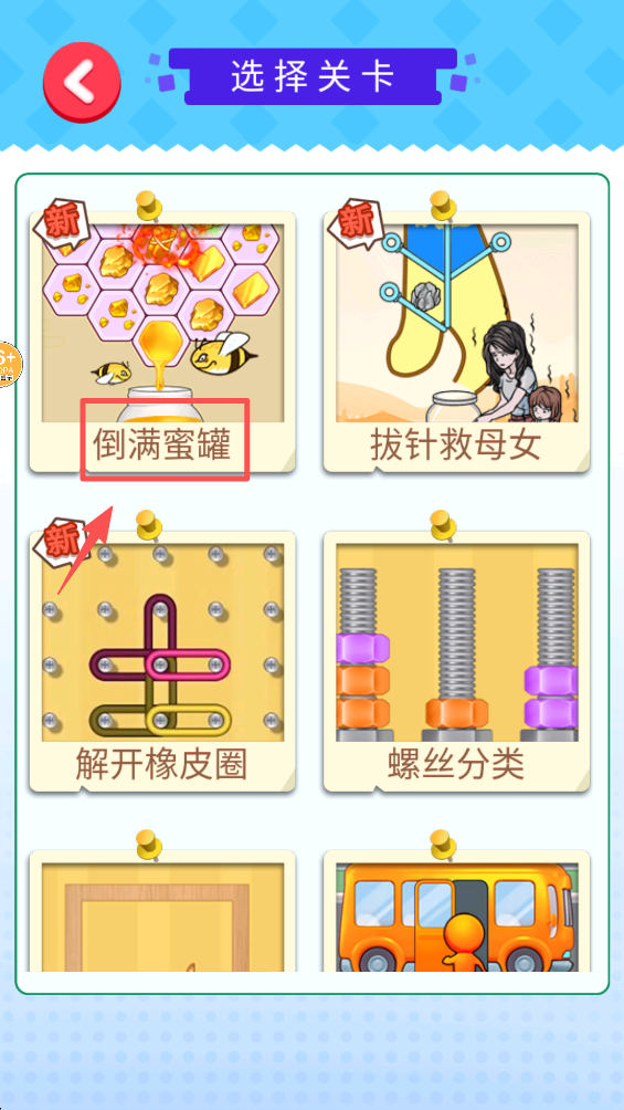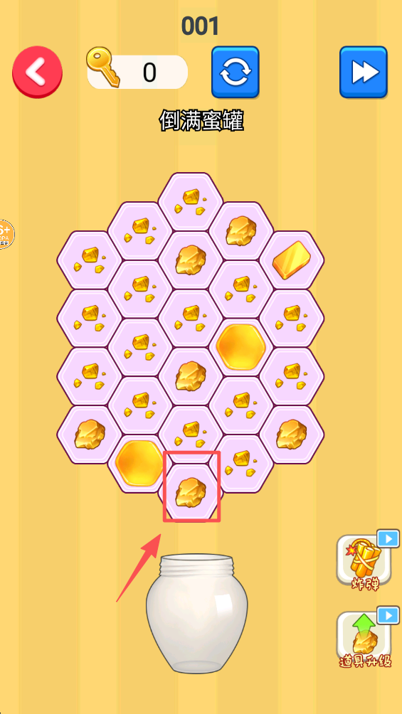 3、点击“倒满蜜罐”关卡开始游戏。这个关卡需要你将蜂蜜倒入蜜罐中。