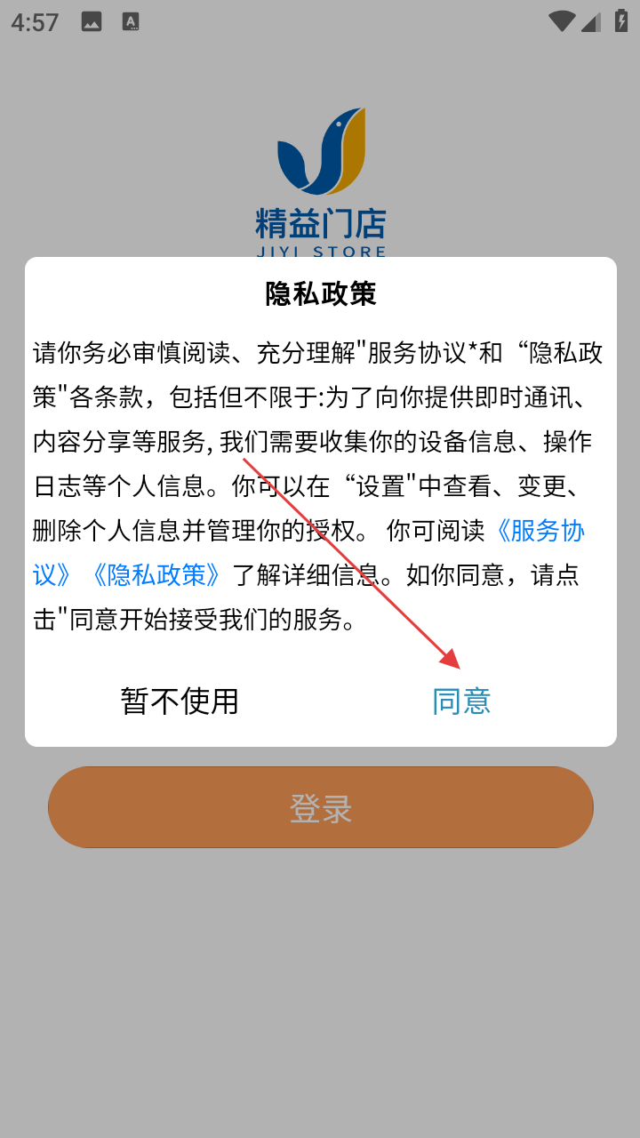 1、打开【精益门店】应用,在隐私政策弹窗点【同意】,接受服务协议。
