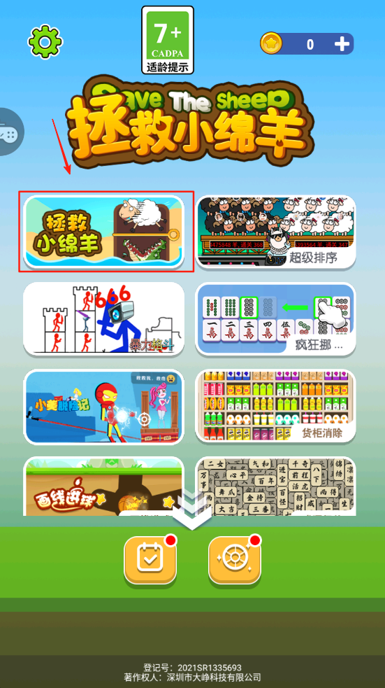 1、点击主界面上的“拯救小绵羊”图标,进入游戏开始挑战。