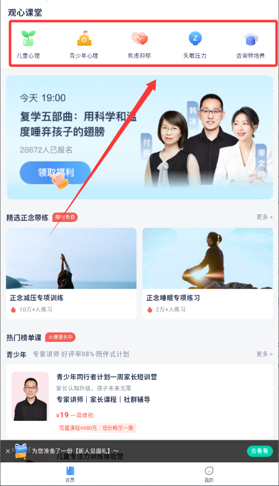 观心课堂提供专业心理健康课程与正念训练服务,涵盖青少年心理、情绪管理、睡眠改善等内容,内置免费课程与专家直播,帮助用户提升心理素质与生活质量。