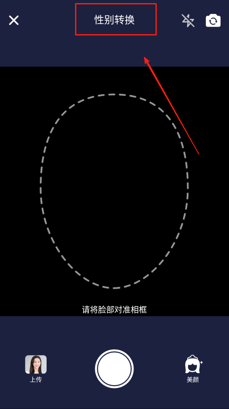 3、在性别转换界面,点击“性别转换”按钮,然后按照提示将脸部对准相框。