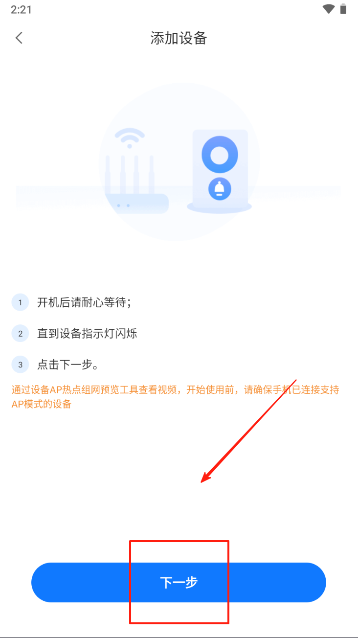 4、按照步骤等待设备指示灯闪烁。点击“下一步”继续设备添加流程。