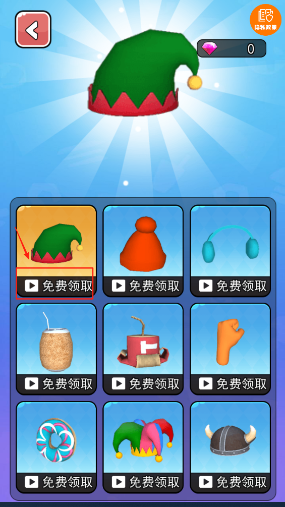 3、点击“免费领取”按钮,获取各种道具,如帽子等,提升角色能力。