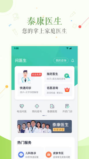 泰康医生app免费可以为您带来大牌医院名医的在线问诊服务,是目前移动端权威的在线问诊平台。软件全新升级设计上线,从原有简单的线上问诊服务拓宽为8大不同种类的咨询业务。泰康医生app免费可以成为您最值得信赖的家庭医生,为您与家人提供更加便捷的专业问医及健康指导。平台可以让传统的看医服务不再受到时间及空间上的限制,让全体国民都可以接收到国内一流的医疗资源。泰康医生app免费综合运用大数据、云技术等手段来提高医疗服务水平,无论是儿科疾病还是高频流行病问题都可以在这里得到最为妥善的解决。