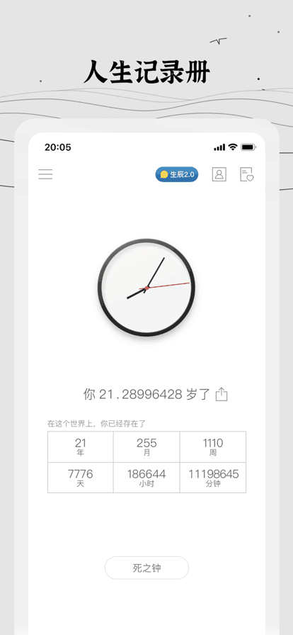 大概很多人都会以为自己还小,时间还很多,所以时间的流逝对于自己就好像不是那么的重要了。你真正计算过你来到这个世上到底多久还剩下多少时间吗?现在有一款叫生辰的手机App,一款关于人生与死的App,为你精确算出人的生命的那一长串数字到底能做些什么,希望能够帮你意识到这一点,有一个良好的心态和正确的人生观。