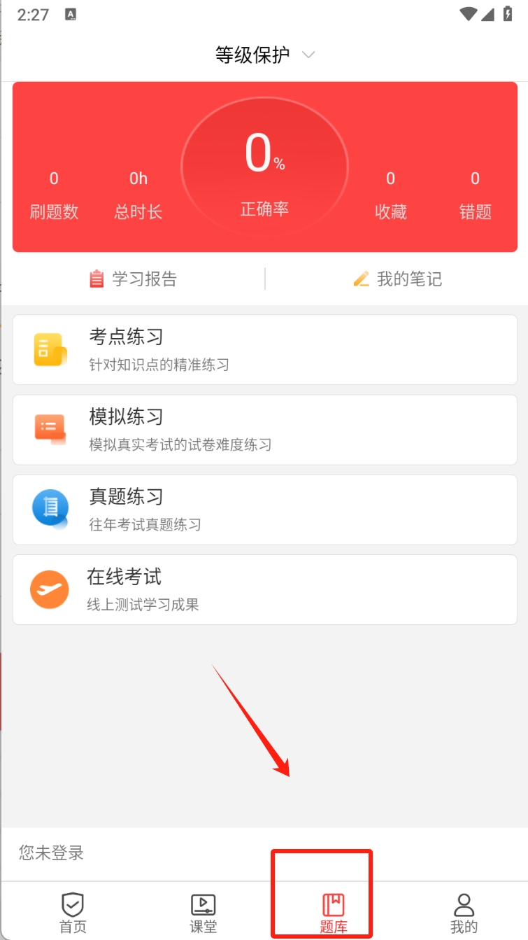 3、进行题库练习和测试,在题库页面,选择“考点练习”或“模拟练习”进行题目练习和测试。