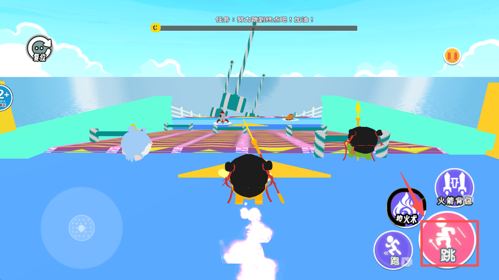 4、在游戏关卡中,点击“火箭背包”和“跳”按钮,控制角色移动和跳跃。