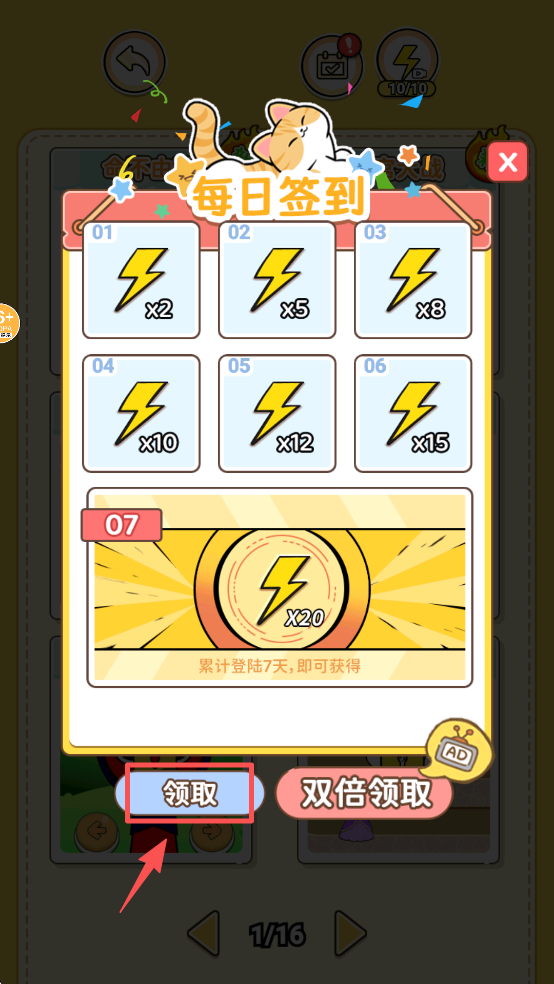 3、在签到界面,点击“领取”按钮,获取每日奖励,积累能量和金币。