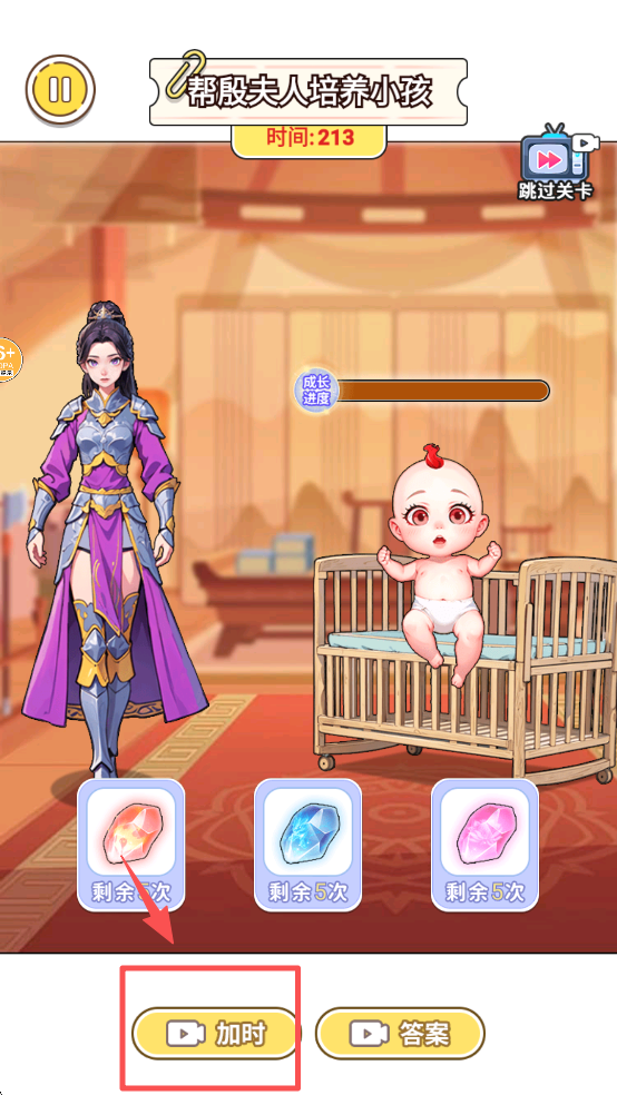 4、在挑战界面,点击“加时”按钮增加时间,帮助你完成关卡。