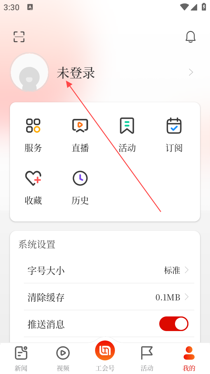 2、进入个人中心,可进行一定的设置,点击【未登录】跳转至登录界面。