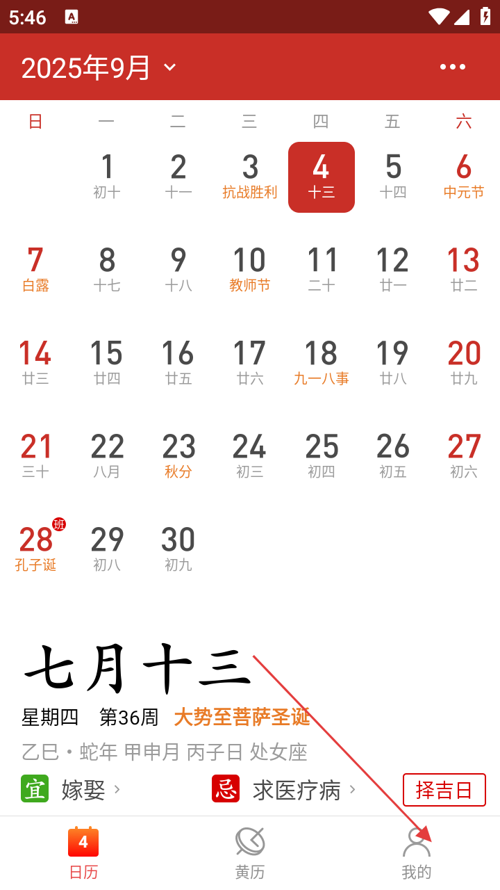 1、打开顺年历,首页显示日历,可查看日期、节气等信息,点击底部【我的】。