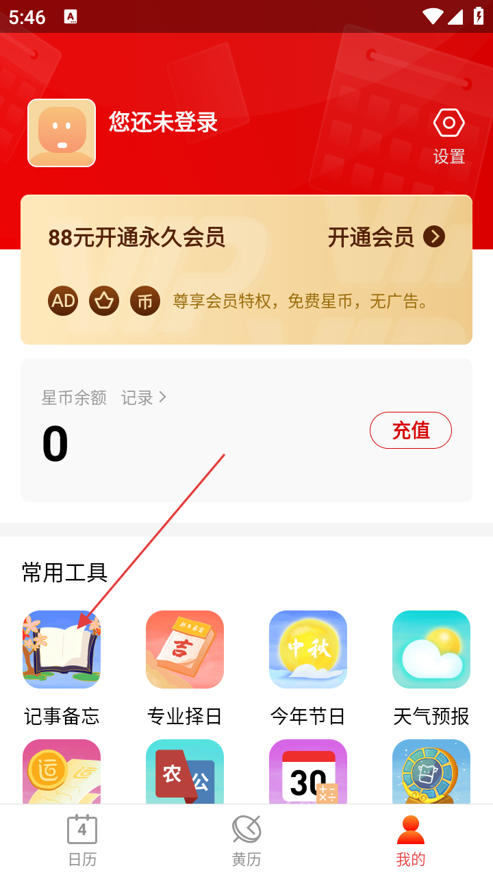 2、进入个人页面,能看到“记事备忘”“专业择日”等常用工具,点击【记事备忘】。