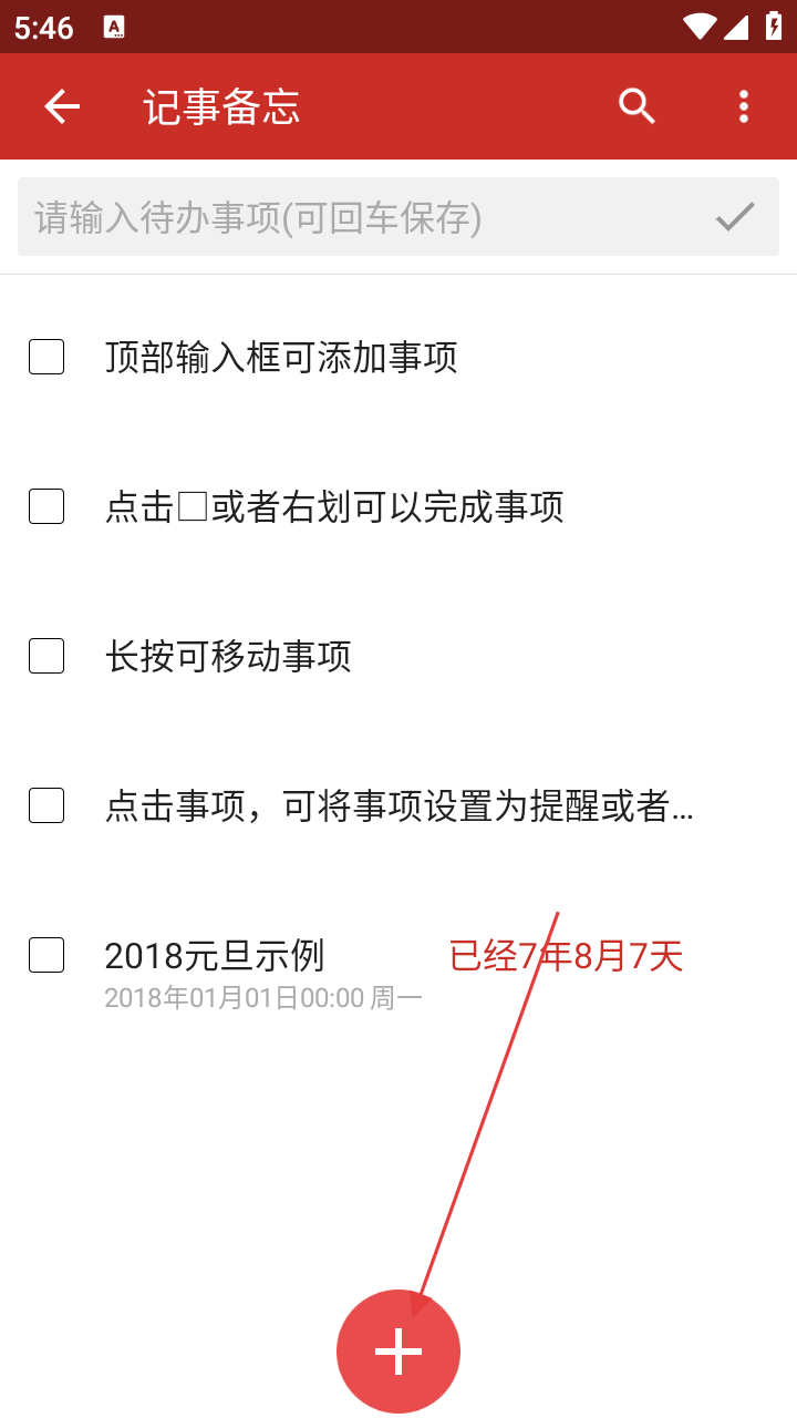 3、进入记事备忘页面,可看到已有事项示例,点击底部红色【+】号,进入便笺编辑页面。