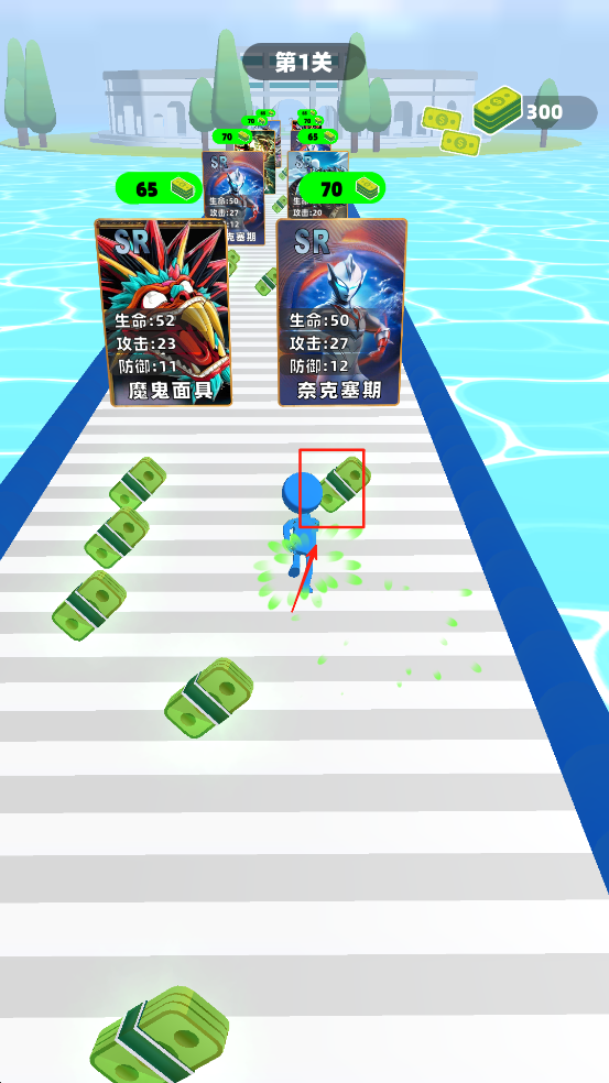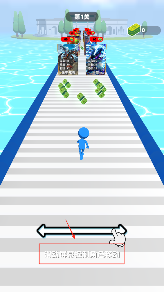 2、滑动屏幕控制角色移动,收集道路上的金币和道具,增强实力。