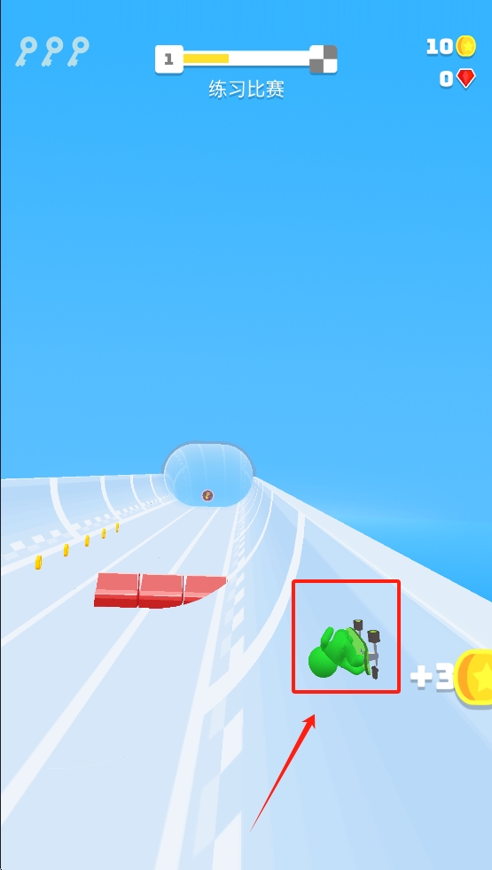 2、在赛道上滑动角色,收集道具和金币,避开障碍物。