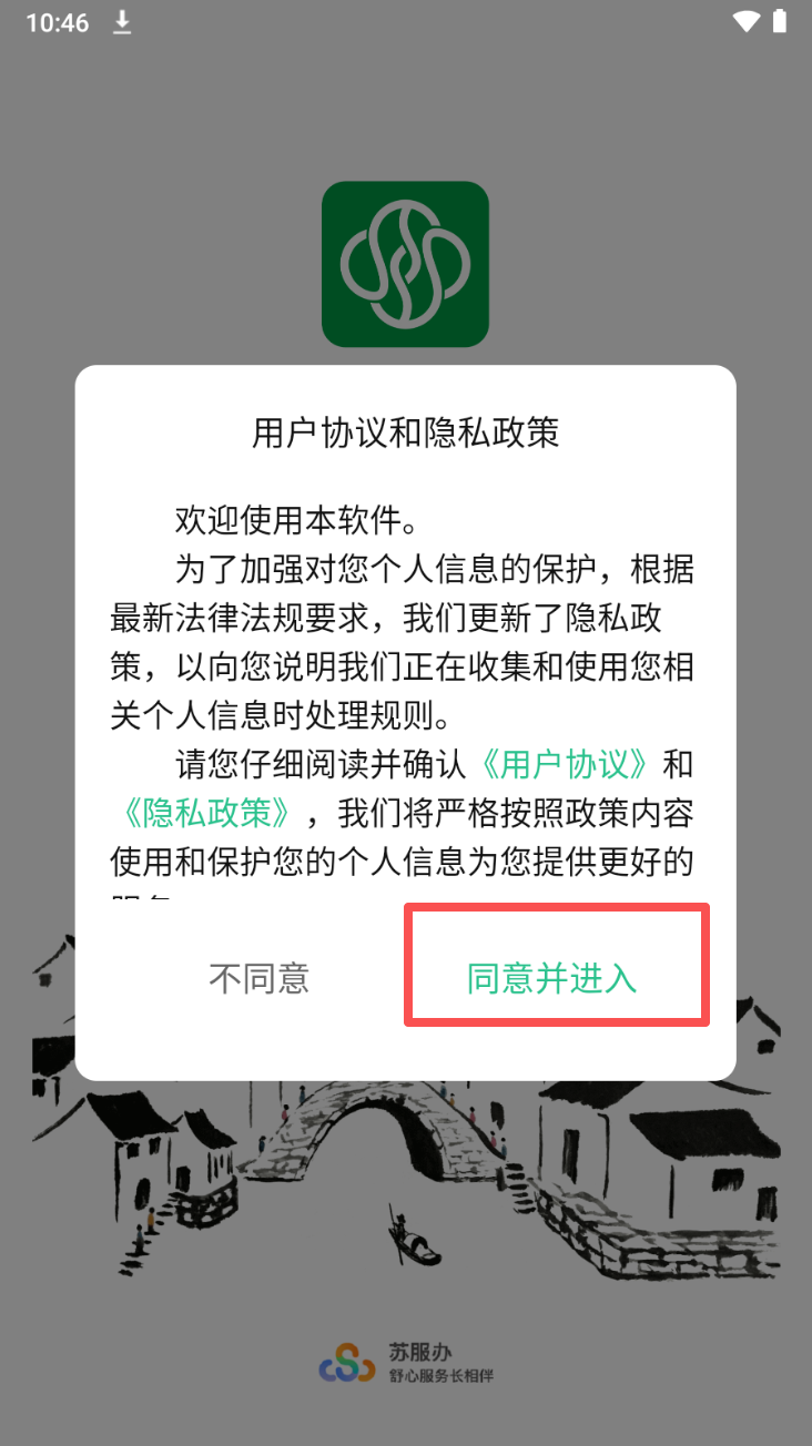 1、在用户协议和隐私政策界面,点击“同意并进入”按钮以接受协议。