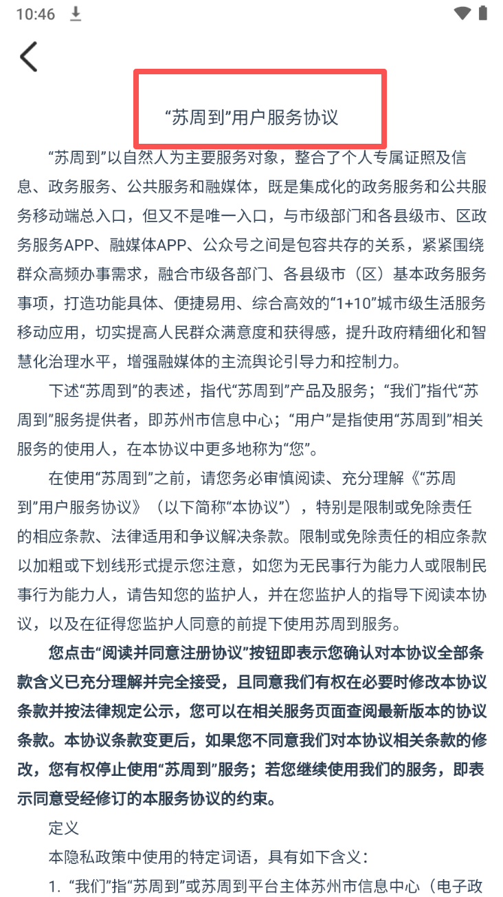 2、在“苏周到”用户服务协议页面,阅读协议内容并了解服务条款。