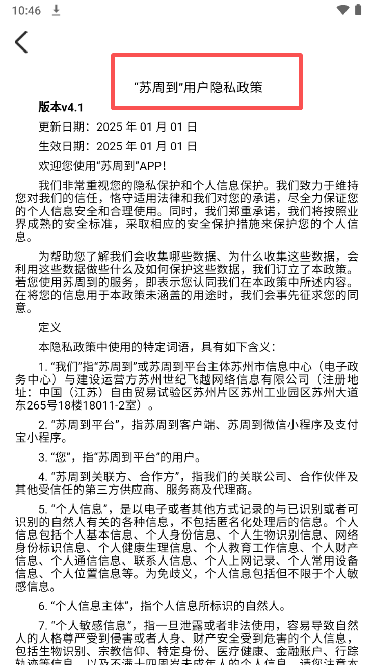 3、在“苏周到”用户隐私政策页面,阅读隐私政策以了解个人信息保护措施。