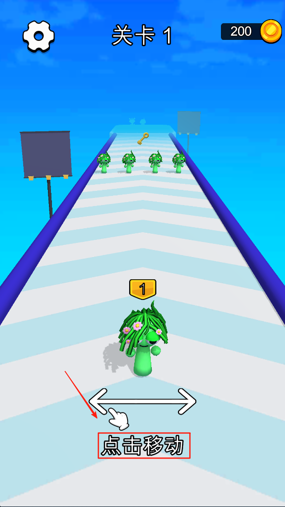 1、点击移动按钮,控制角色在赛道上前进,避开障碍物,收集金币和钥匙。