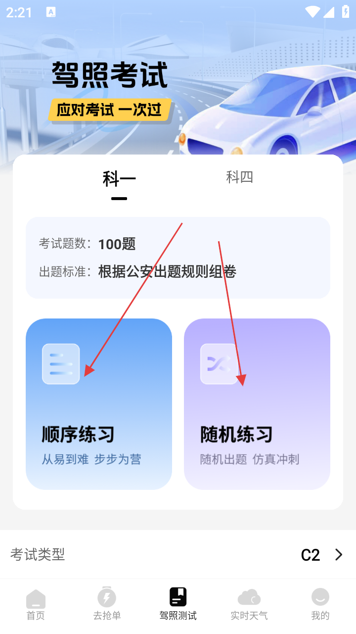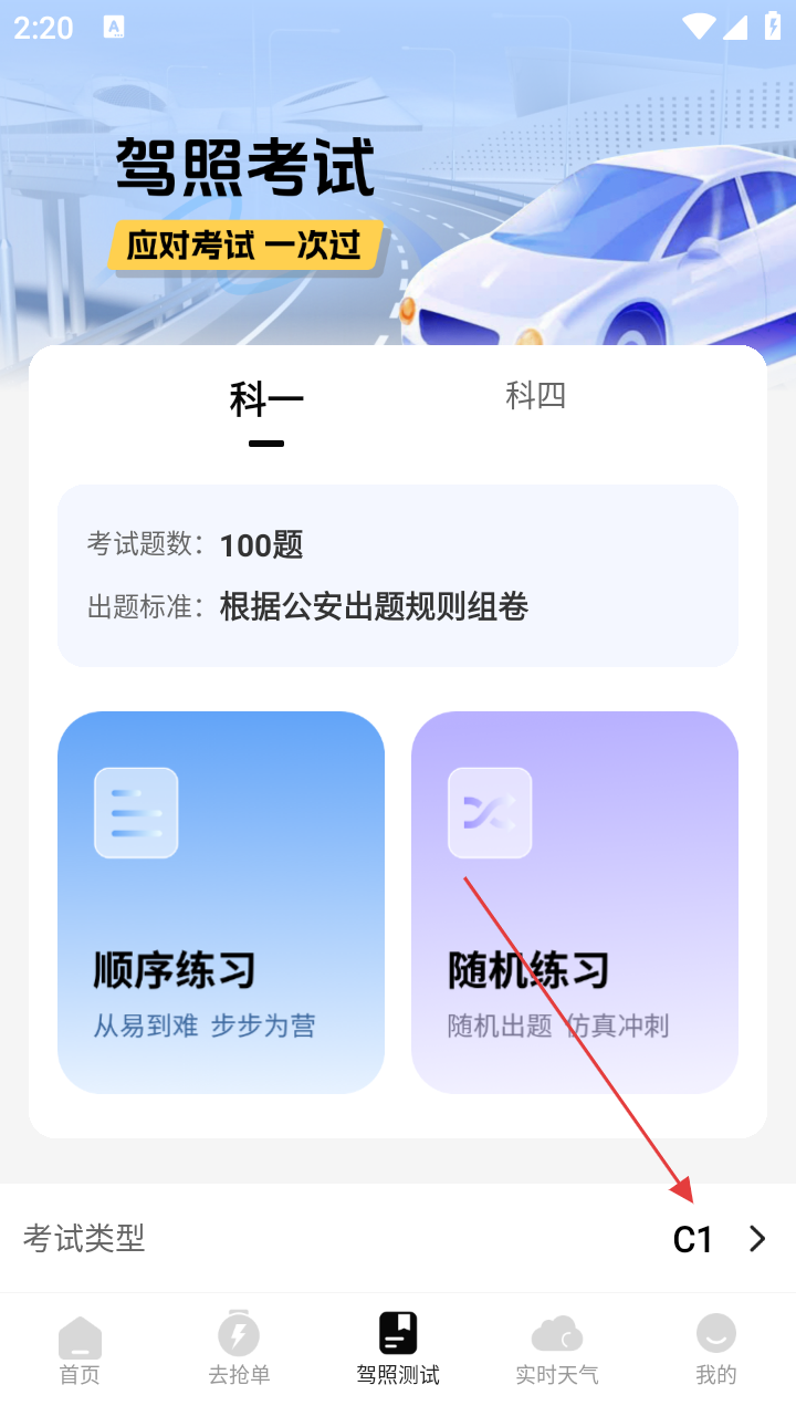 2、驾照测试页选考试类型(如C1/C2),确定后进入练习/考试界面。