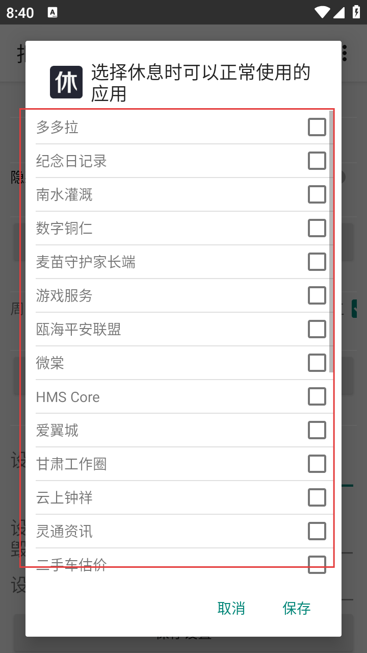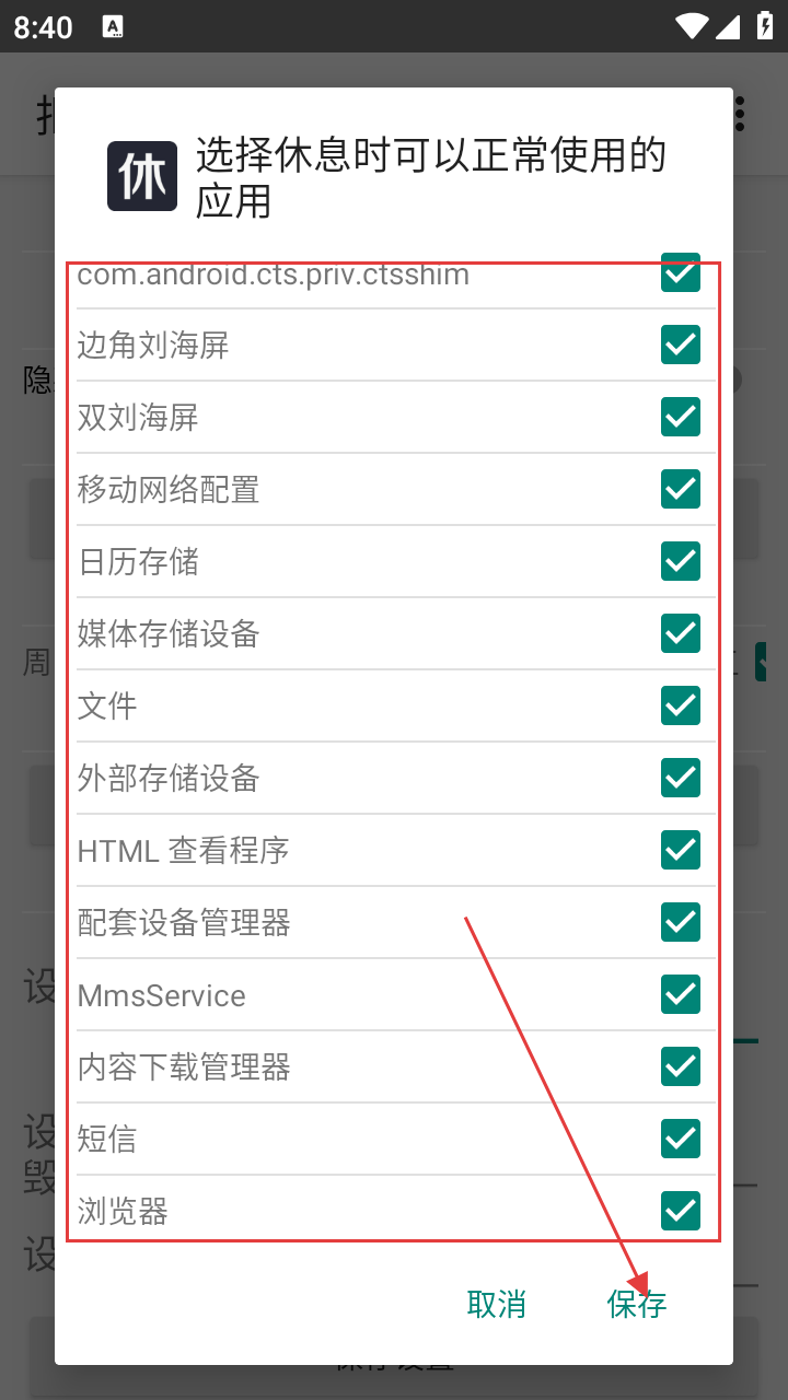 2、在应用列表,勾选休息时可使用的应用,如系统应用里的浏览器等。