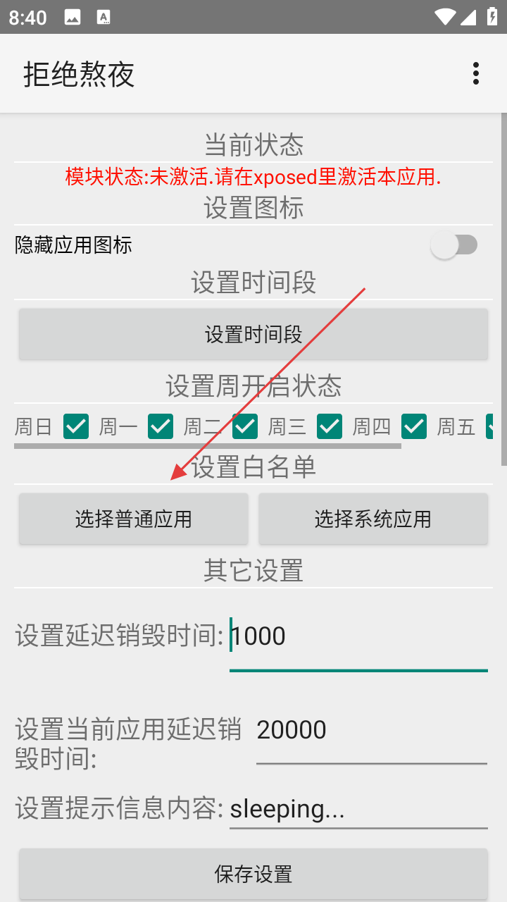 1、打开拒绝熬夜,点【设置白名单】,选要添加的应用类型。