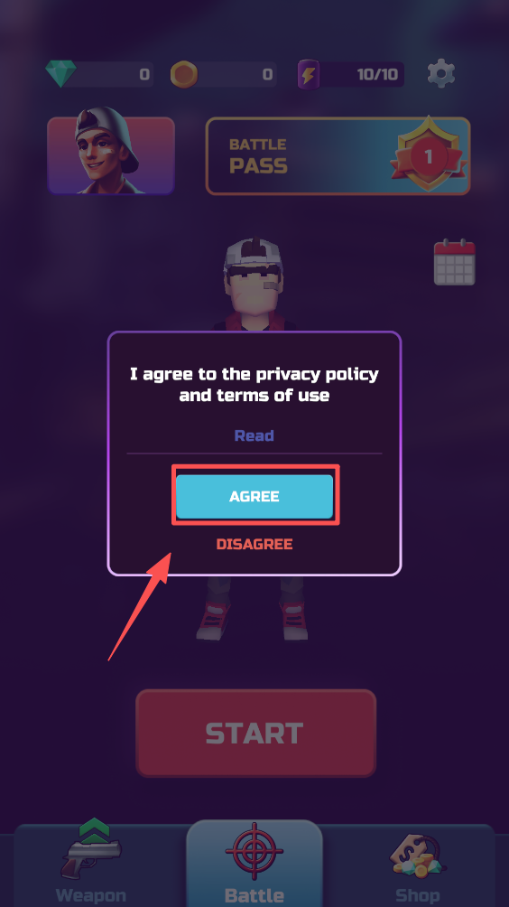 1、点击“同意”按钮,接受隐私政策和使用条款,以便开始游戏。
