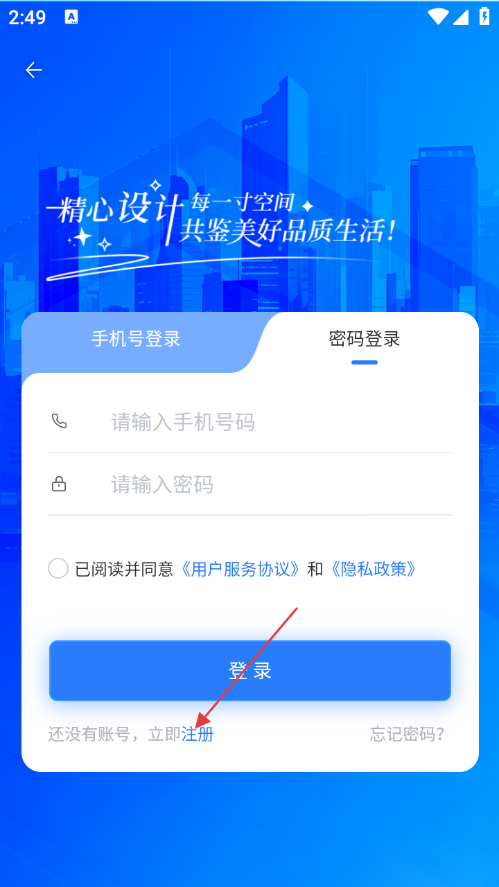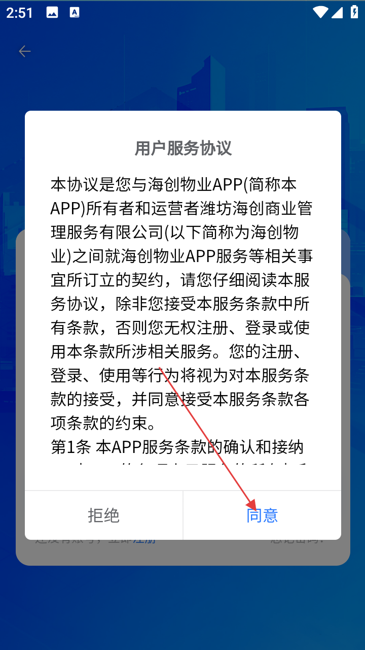 1、打开“海创物业”APP,在弹出的“用户服务协议”窗口中,点击【同意】按钮。